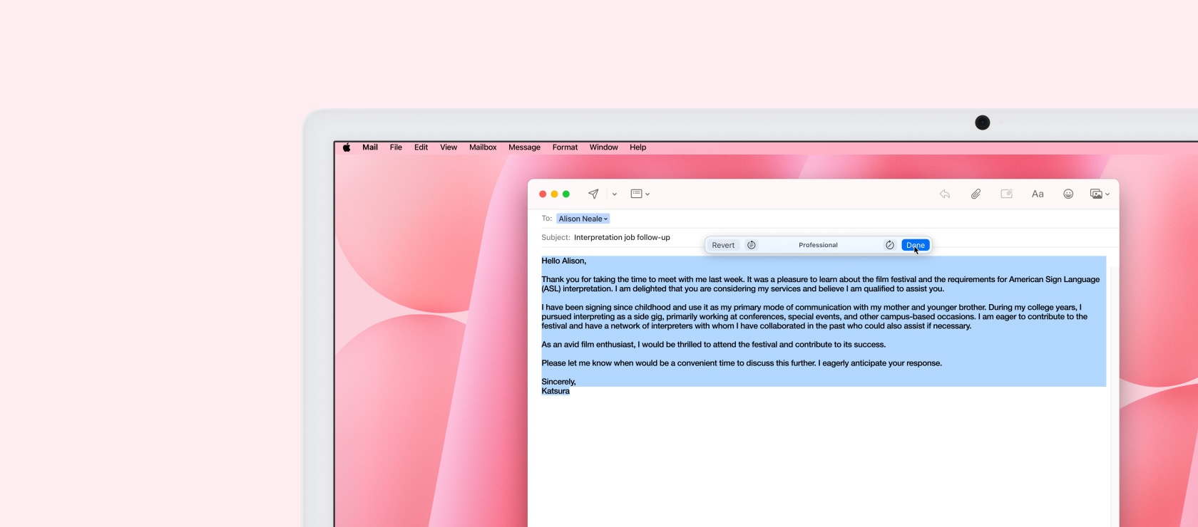 Writing Tools. Apple Intelligence can proofread your text and rewrite different versions until the tone and wording are just right, and summarise selected text with a click.
