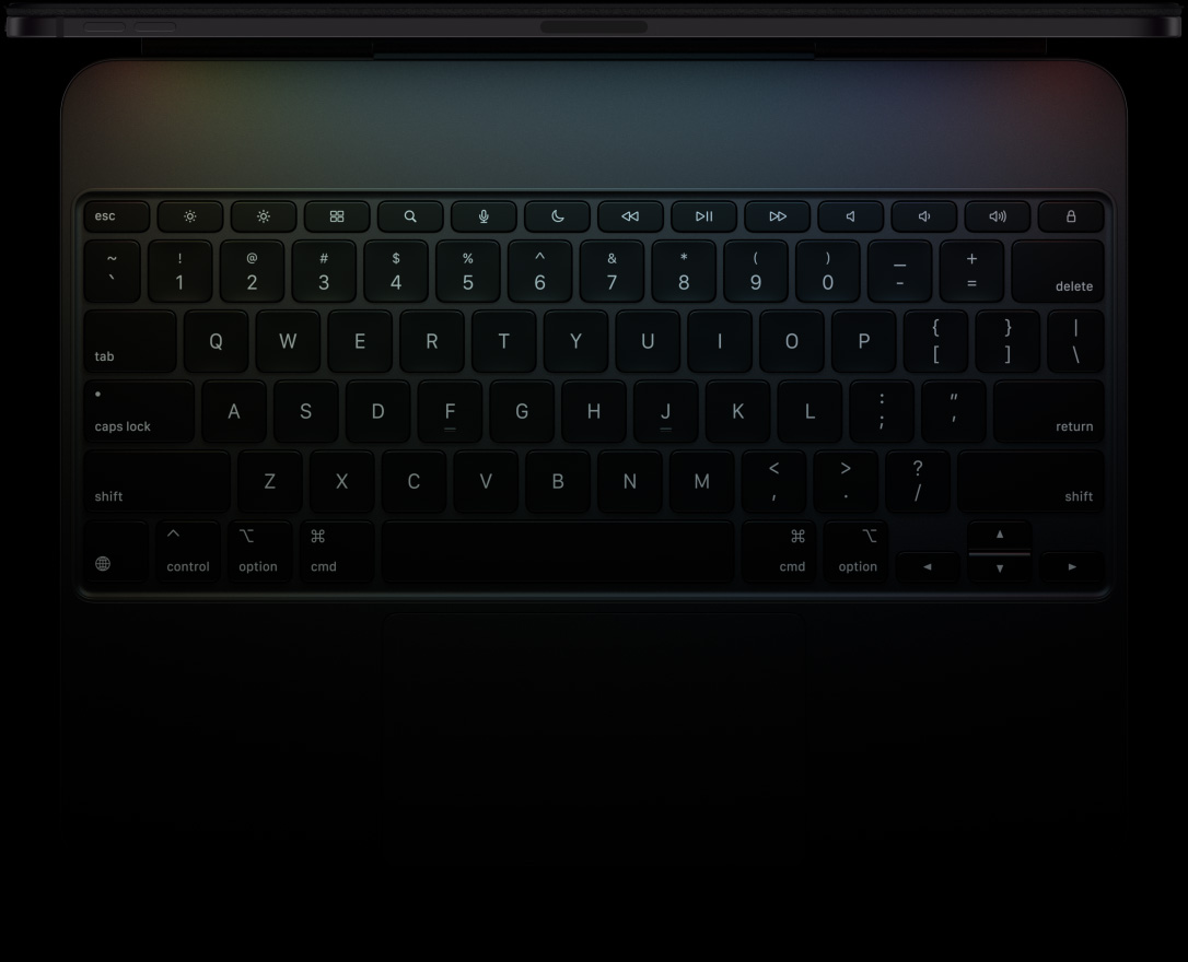 Magic Keyboardは、驚くほど快適なキーボードとトラックパッドを搭載12。薄くてポータブルなデザインで、アルミニウムのパームレストも用意されています。ファンクションキー列が加わり、大きなガラス製トラックパッドは触覚フィードバックに対応。高い精度が求められる作業やMulti-Touchジェスチャーに理想的です。