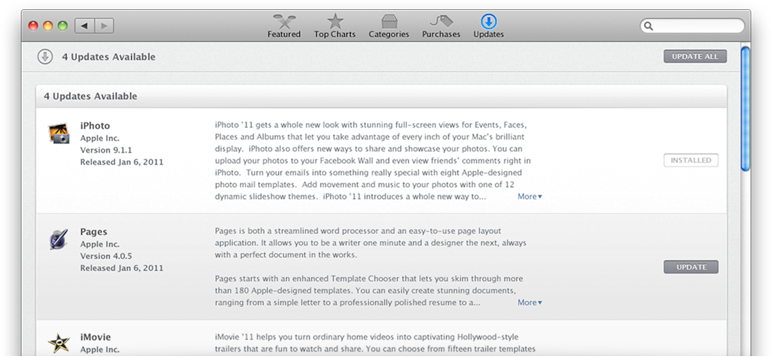 透過 OS X Lion 內建的 Mac App Store,取得你 Mac 所需的應用程式從未如此容易。再也不需包裝盒、光碟及費時的安裝。只須一按,就能在你的 Mac 下載和安裝任何應用程式。