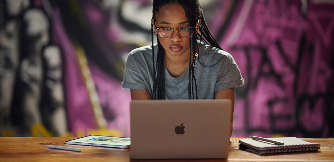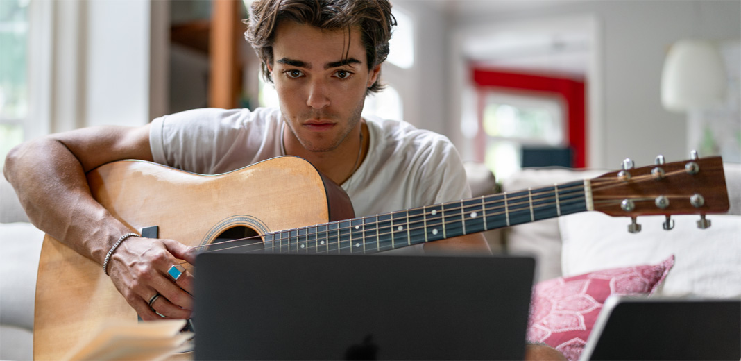 Als junger Sänger und Songwriter nützt Max Pro Apps wie Logic Pro, um Musik in Studioqualität zu machen. So meistert er mit dem MacBook Pro den Unterricht zu Hause.