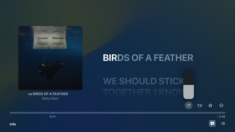 Pouštěj si přes 100 miliónů skladeb, 30 000 playlistů a živá rádia na velké obrazovce. Nebo osobně vstup na scénu a podle textů zobrazovaných v reálném čase si zazpívej hitovky s Apple Music Sing.6 Vokály si můžeš přizpůsobit podle sebe a zpívat hlavní hlas, pustit se do duetu nebo broukat doprovodné melodie.4