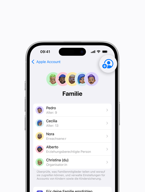 Du kannst Tipps und Vorschläge erhalten, wie du Features für Familien optimal nutzen kannst. Öffne einfach „Einstellungen“, tippe auf deinen Namen, auf „Familie“ und dann auf „Für deine Familie empfohlen“.