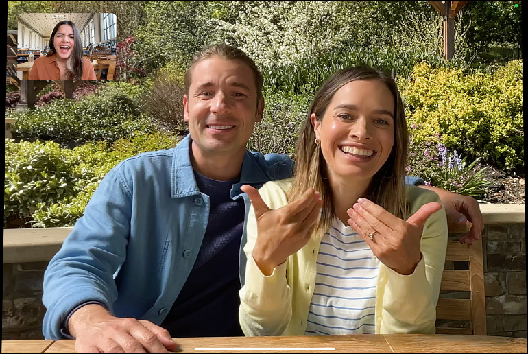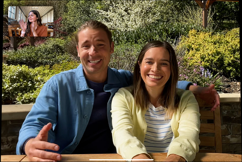 iPad Air, vu de face, la personne utilisatrice est sur FaceTime et en train de consulter Keynote, un autre iPad Air vu de dos est en arrière-plan