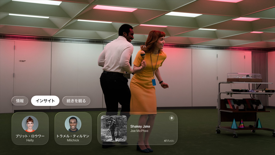 インサイト。Apple Originalのシリーズや映画を観ながら、作品の情報をチェックしましょう。この俳優は誰?このBGMの曲名は?詳しく知りたい時は、メディアプレーヤーのコントロールを表示するだけです。シーンが変わると、詳しい情報も自動で更新。iPhoneをApple TVのリモコンとして使っている時は、iPhoneにインサイトの情報が現れます5。