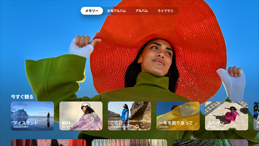 写真。iCloud共有写真ライブラリを使えば、家族全員がそれぞれの写真をかつてないほど簡単に楽しめます。ライブラリにあるすべての写真をテレビに映し出すこともできます。「メモリー」をスクリーンセーバに設定しましょう。あなたの大切な瞬間が大画面でいきいきとよみがえり