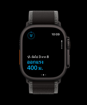 ออกกำลังกาย มุมมองการ ออกกำลังกายจะ แสดงตัว ชี้วัด ที่คุณ เลือกไว้ ให้เห็น ตรงหน้าเสมอ เพื่อให้ ติดตาม ได้ง่าย โดย คุณสามารถ สลับดู ตัวชี้วัดต่างๆ อย่าง โซน อัตราการเต้น ของหัวใจ, รอบ และระดับความสูงได้ อย่างง่ายดาย เพียงหมุน Digital Crown