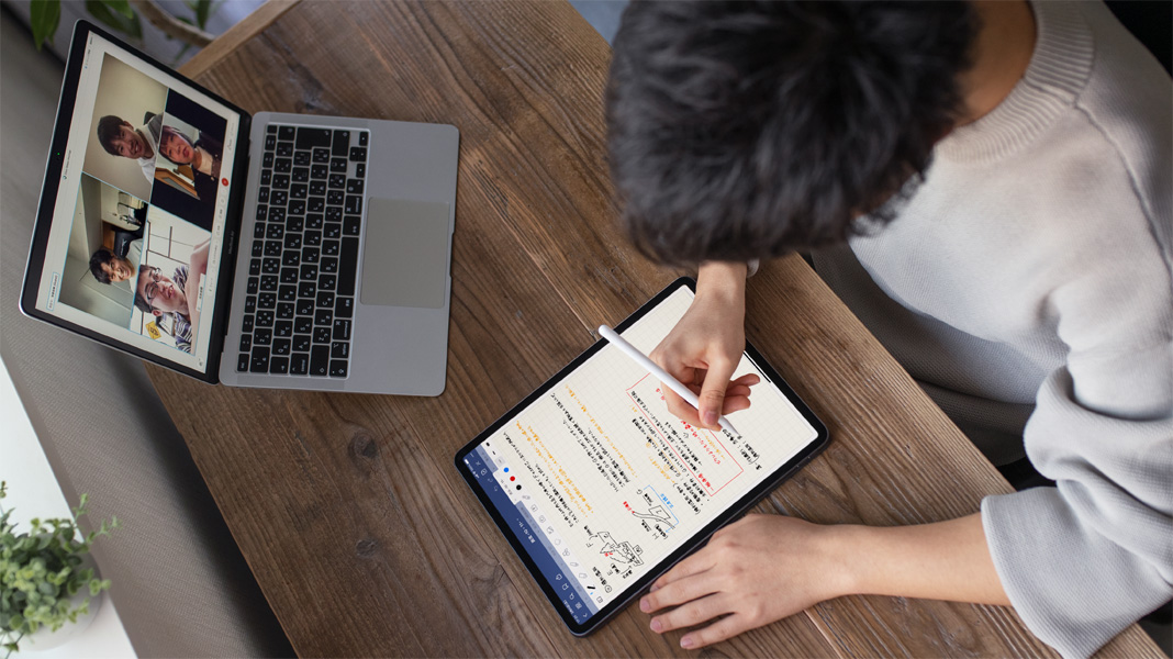 Giống như bao sinh viên khác, Takuto đã thích nghi với việc học từ xa bằng cách tận dụng công nghệ tiên tiến. Trong các lớp học trực tuyến, anh sử dụng chế độ Split Screen trên iPad để xem bài giảng của giáo sư ở một bên và ghi chú ở bên còn lại. Và trong các nhóm học trực tuyến, Takuto đã sử dụng FaceTime trên máy Mac để kết nối với các bạn học cùng lớp, đồng thời tận dụng trang giấy vẽ đầy cảm hứng trên iPad để thực hiện các dự án nhóm.