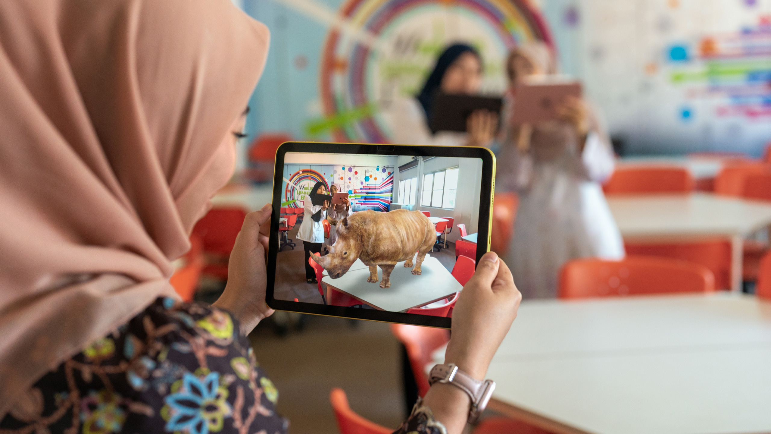 Giáo viên Trường Sekolah Seri Puteri làm việc với Ah Ho Yen Sze (ALC) để khám phá lợi ích của công nghệ thực tế ảo tăng cường trong lớp học với iPad. -
