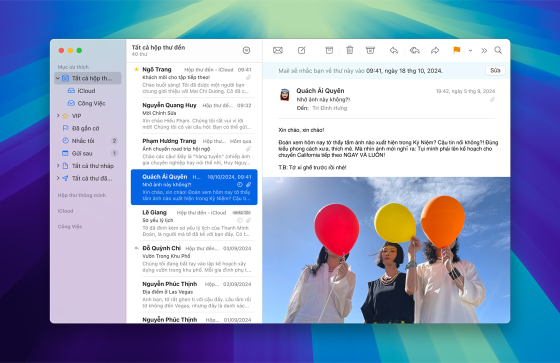 iCloud Mail được tích hợp một cách liền mạch với ứng dụng Mail trên iPhone, iPad hoặc Mac của bạn và iCloud.com giúp bạn dễ dàng gửi và nhận email từ bất kỳ đâu. Các tính năng bảo mật như chống thư rác và chống lừa đảo được tích hợp để phát hiện và chặn thư rác trước khi chúng được gửi đến hộp thư của bạn. Thiết lập địa chỉ email @icloud.com của riêng bạn một cách dễ dàng và khi bạn đăng ký iCloud+, bạn sẽ có thể cá nhân hóa email của mình bằng tên miền tùy chỉnh.