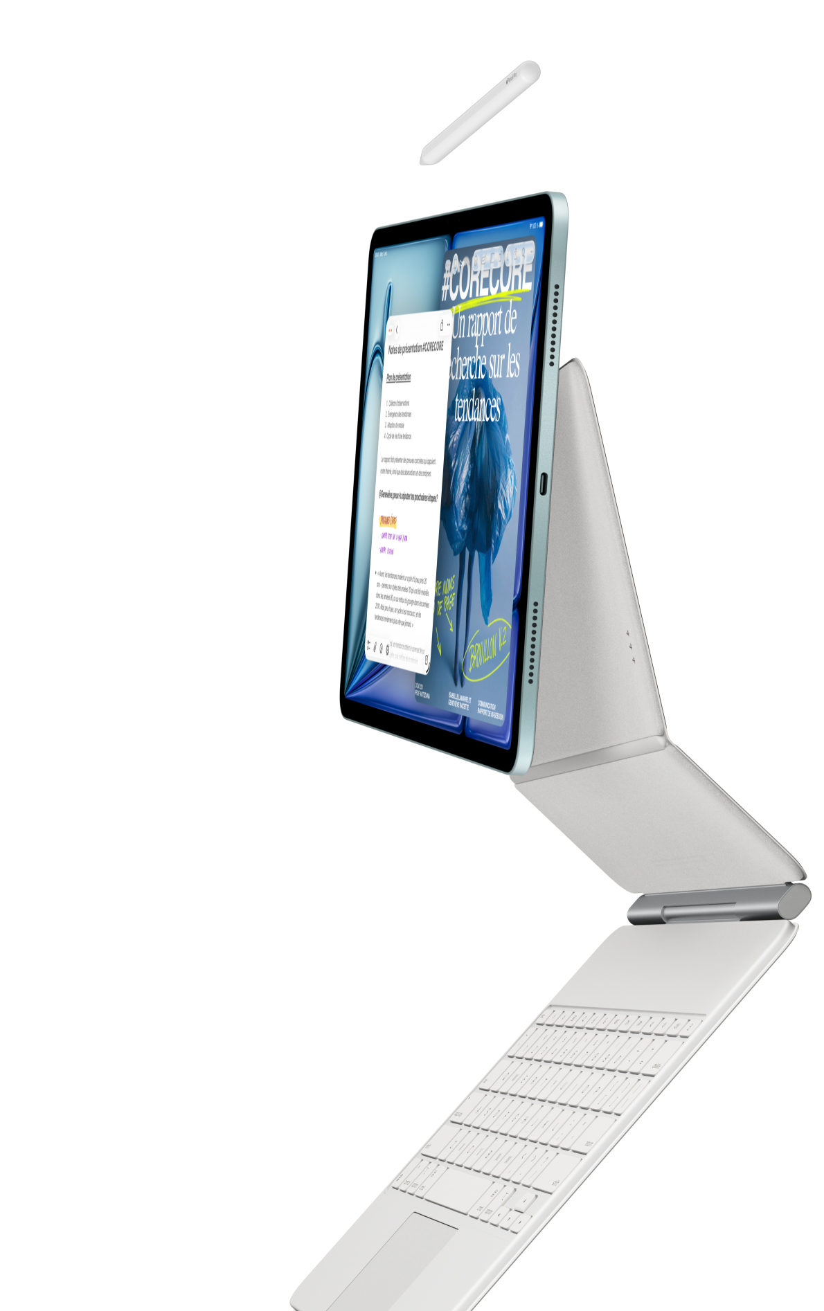 Un iPad Air, auquel sont fixés un Magic Keyboard pour iPad Air, et un Apple Pencil Pro