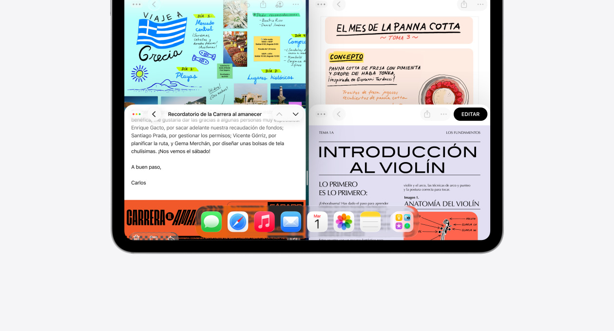 Desliza hacia la izquierda o hacia la derecha para organizar las ventanas. O divide la pantalla de tu iPad en tercios o cuartos. Todo encaja.