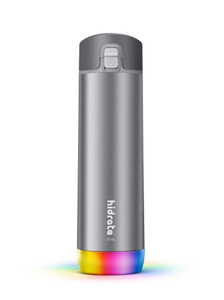 HidrateSpark STEELはステンレススチール製の真空断熱チャグボトル。飲み物を最長24時間保冷します。LEDスマートセンサーパックが飲むべきタイミングを光って知らせ、Bluetooth経由でHidrateSparkアプリと同期して水分摂取量を記録します。チャグキャップとストローキャップが付属しています。