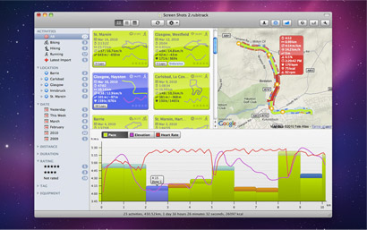 rubiTrack은 Mac에서 쓰는 운동 트랙커이자 연습 기록장입니다. 이 앱은 달리기, 바이킹, 걷기 같은 운동 정보를 보여주고, 분석하고, 관리합니다. 다수의 GPS 기기에서 운동 기록을 읽어들인 다음 지도에 표시하고 운동 세부 사항을 분석해드립니다.