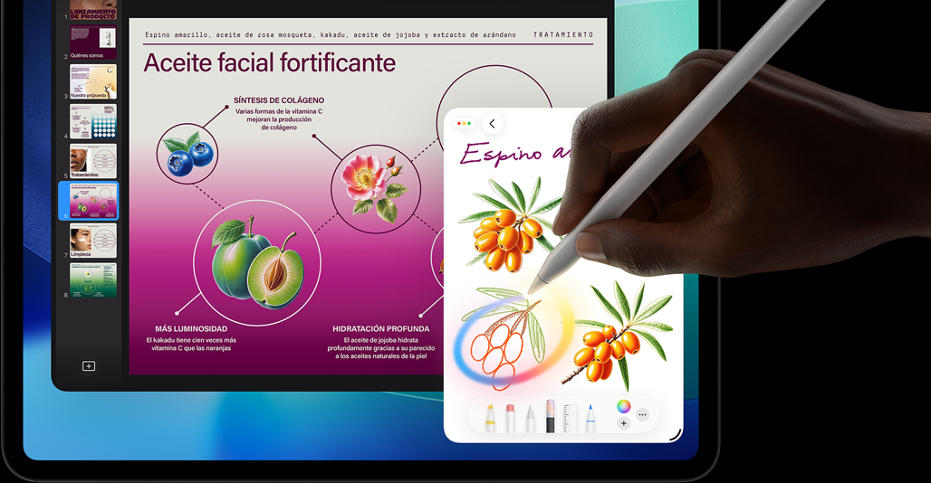 Tu iPad Pro se convierte en un gran lienzo y también en el mejor dispositivo del mundo para tomar notas gracias al Apple Pencil (segunda generación). Dibuja, haz anotaciones, rellena campos de texto y mucho más. El Apple Pencil te permite hacer todo de una forma tan intuitiva y precisa que parece magia.