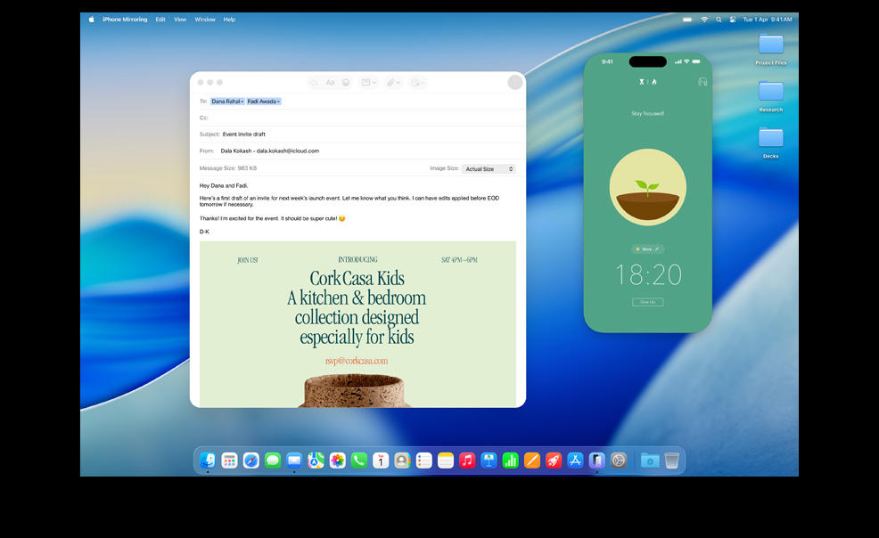 iPhone Mirroring lets you see and use your iPhone right from your Mac.5 So even if your phone is getting charged across the room, you can still access all your favorite iPhone apps. Live Activities from your iPhone also appear on your Mac. So when timely events occur, you don’t have to reach for your phone to stay in the know. You can even drag and drop a video from your Mac to your iPhone, so you can continue editing on the go.