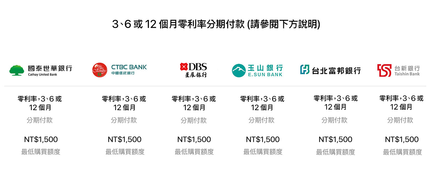 零利率分期付款方案僅適用於 NT$1,500 以上之購買金額。零利率分期付款僅可在 Apple 直營店、透過電話購買、透過交流購買及 Apple Online Store 購物時享有。可以使用玉山銀行、台新銀行、星展銀行 (台灣)、國泰世華銀行、台北富邦商業銀行、或中國信託商業銀行的信用卡進行購物。